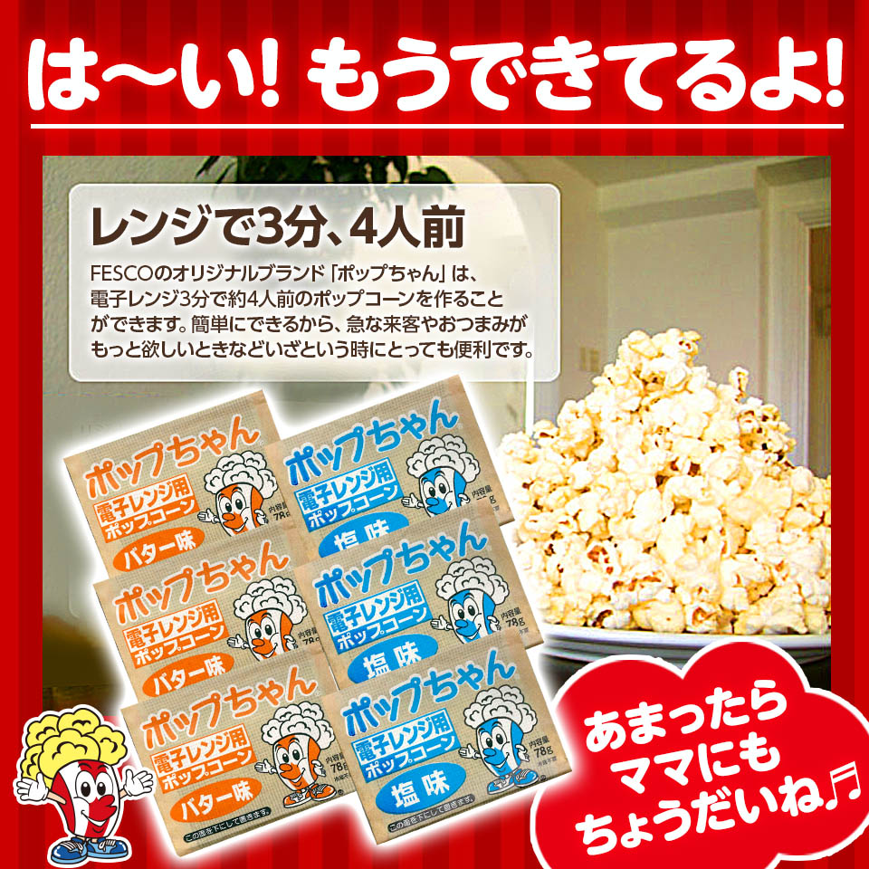 【選べる2種】電子レンジ用ポップコーン ポップちゃん 78g|塩味・バター味|72袋・144袋